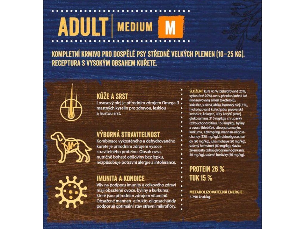 Kompletní kuřecí krmivo pro dospělé psy středních plemen (10–25 kg) ve věku nad 12 měsíců.