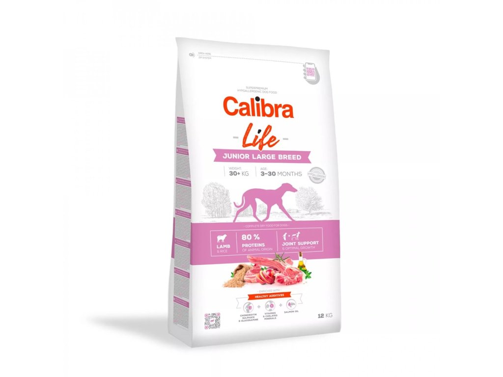 Calibra Dog Life Junior Large Breed Lamb jsou granule pro mladé psy (3–30 měsíců) velkých plemen (nad 30 kg) s jehněčím masem. Vyznačují se vysokou stravitelností, jsou hypoalergenní, velikost granulí je přizpůsobena fyziologickým potřebám velkých psů. Kvalitní proteiny, které jsou z 80 % živočišného původu, dodají dospívajícímu psovi potřebnou energii a dostatek živin pro jeho růst a vývoj. Receptura je sestavena jako monoproteinová - pouze jeden zdroj živočišných bílkovin. Jsou obsažena chondroprotektiva, která pomáhají pečovat o kloubní chrupavku namáhaných kloubů velkých plemen, a předchází tím problémům s klouby v dospělosti. Vitaminy a minerály přispívají k celkovému zdraví a posílení imunity. Lososový olej pomáhá pečovat o zdraví kůže a zářivou srst.