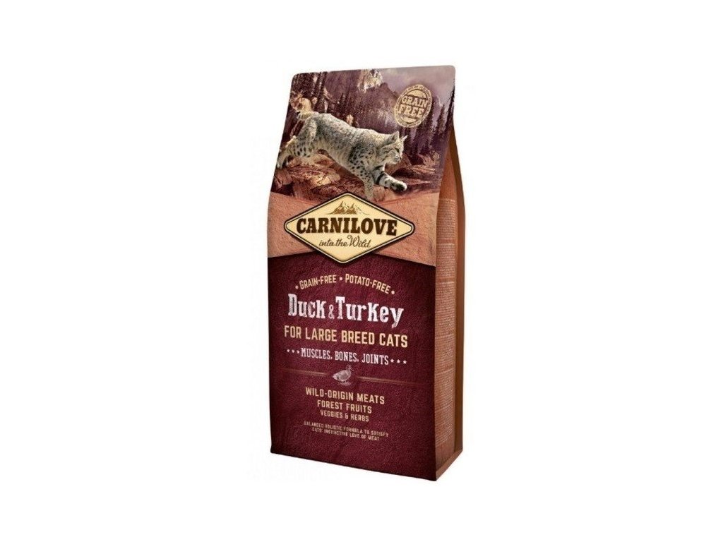 Holistické a vysoce kvalitní krmivo z kachny a krocana ro kočky velkých plemen. Bez obilovin a brambor. Vhodné především pro perfektní kondici svalů, kostí a kloubů. Dospělé kočky potřebují pro udržení kondice potravu bohatou na kvalitní bílkoviny s dostatečným a vyváženým obsahem potřebných aminokyselin. Krocan a kachna mají vysoký podíl stravitelných proteinů a nenasycených tuků pro výživu svalstva a doplnění energie. Vyšší zátěž pohybového aparátu kompenzují obsažená chondroprotektiva a přírodní látky na podporu hybnosti kloubů a pevnost šlach a vazů.