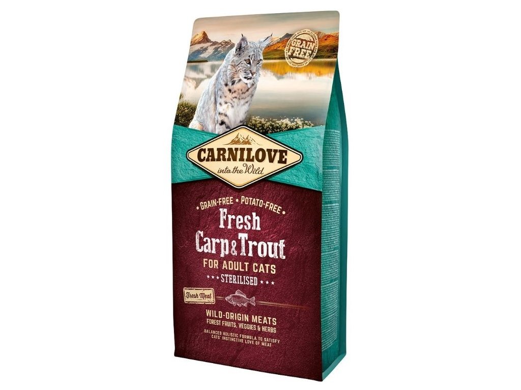 Carnilove Kapr & Pstruh je superprémiové, holistické kvalitní krmivo bez obilovin a brambor s čerstvým masem pro dospělé kastrované kočky. Krmivo bylo navrženo s respektem k přirozené skladbě potravy koček a poskytuje vaší kočičí společnici vyváženou stravu bohatou na čerstvé maso v kombinaci s různými druhy zeleniny, lesního ovoce a bylin.