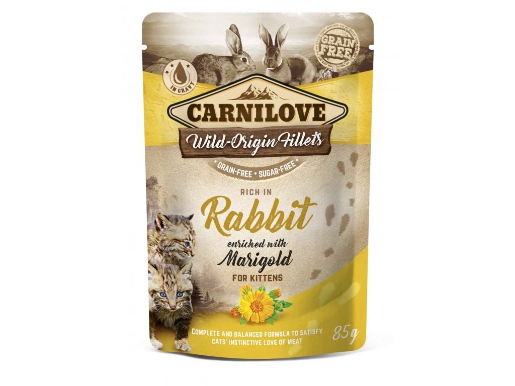 Kapsička pro koťata Carnilove neobsahuje žádné obiloviny a cukr. Receptura Rabbit je bohatá na králičí maso a je doplněna o extrakt z měsíčku. Králičí filetky jsou naloženy ve šťávě. Jedná se o kompletní krmivo pro koťata a mladé kočky. Kapsičky pro kočky Carnilove Cat Pouch lze zakoupit v 7 lahodných příchutích, ale pouze tato je určena speciálně pro koťata.