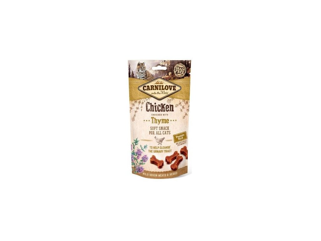 Poloměkké a křupavé pamlsky pro kočky Carnilove Snack s masem z kuřete. Lahodné pamlsky Chicken with Thyme (kuře s tymiánem) jsou vhodné pro všechny kočky. Ve složení nejsou obsaženy žádné obiloviny a ani umělá barviva. Tymián podporuje zdraví močových cest.