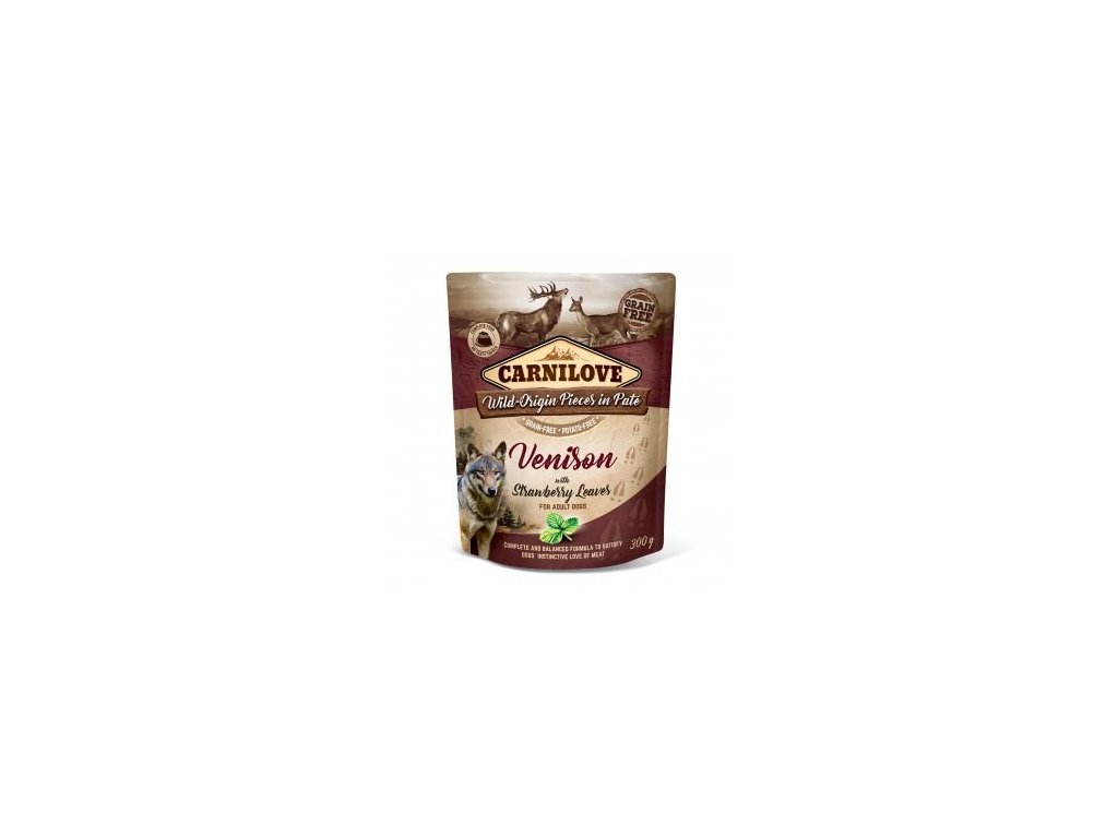 Kapsička pro psy Carnilove neobsahuje žádné obiloviny ani brambory. Receptura Venison je bohatá na maso ze zvěřiny a je doplněna o listy jahodníku. Zvěřinové filety jsou naloženy v paštice. Jedná se o kompletní krmivo pro psy. Kapsičky pro psy Carnilove Dog Pouch Paté lze zakoupit v 9 lahodných příchutích.
