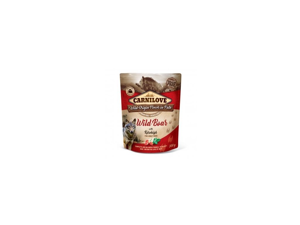 Kapsička pro psy Carnilove neobsahuje žádné obiloviny ani brambory. Receptura Wild Boar je bohatá na kančí maso a je doplněna o plátky růží. Filety z divočáka jsou naloženy v paštice. Jedná se o kompletní krmivo pro psy. Kapsičky pro psy Carnilove Dog Pouch Paté lze zakoupit v 9 lahodných příchutích.