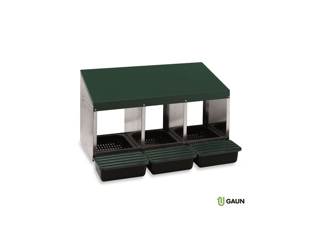 Hnízdo pro snášku Gaun se 3 přihrádkami a plastovou podlahou je odborně vyrobeno pro nosnice a zajišťuje bezpečné a pohodlné prostředí pro snášku. Jeho mírně nakloněná plastová podlaha umožňuje, aby se vejce jemně kutálela do samostatného plastového tácku, čímž je udržuje čistá a bezpečná.