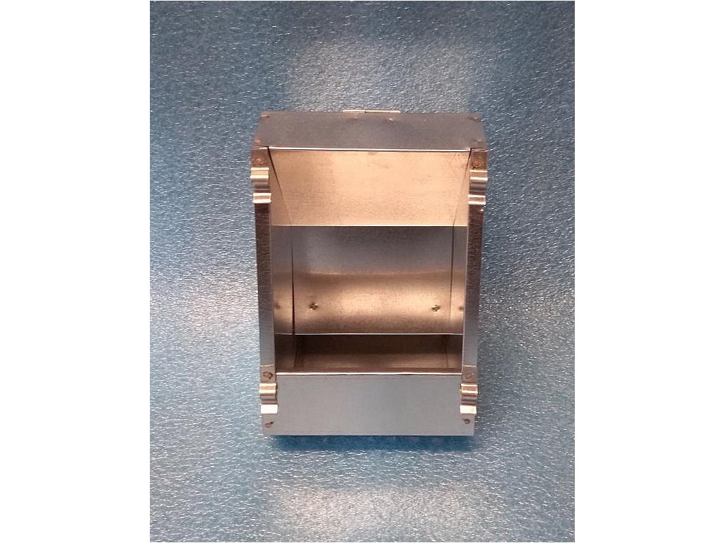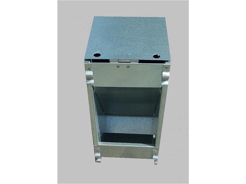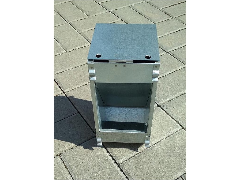 - jednokomorový, zavěšení 4 háčky zvenku na dvířka kotce po předchozím vystřižení pletiva dvířek. Vyrobeno z pozinkovaného plechu, pro chovného králíka, nebo pro 3 výkrmové králíky.